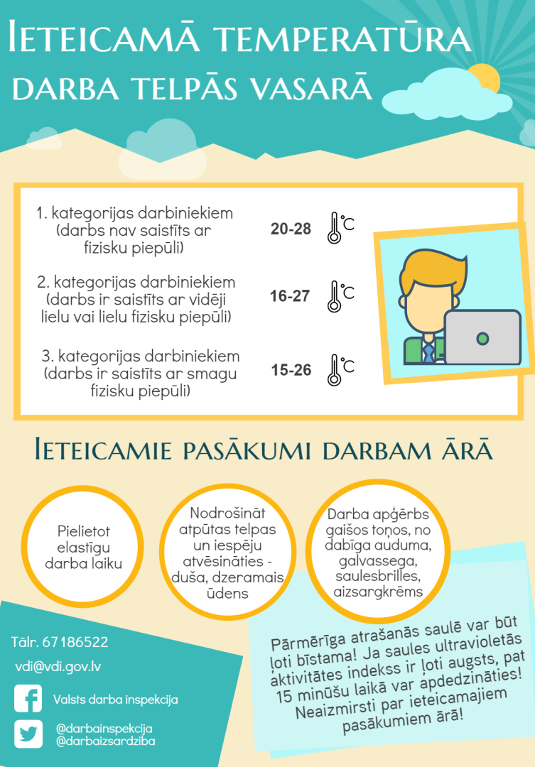 Valsts darba inspekcija atgādina, ka darba devējam darba telpās ir jānodrošina darba raksturam un nodarbināto fiziskajai slodzei atbilstošs mikroklimats. Darbiniekiem ir jāturpina pildīt savi darba pienākumi arī tad, kad ārā paaugstinās gaisa temperatūra ir paaugstināta.