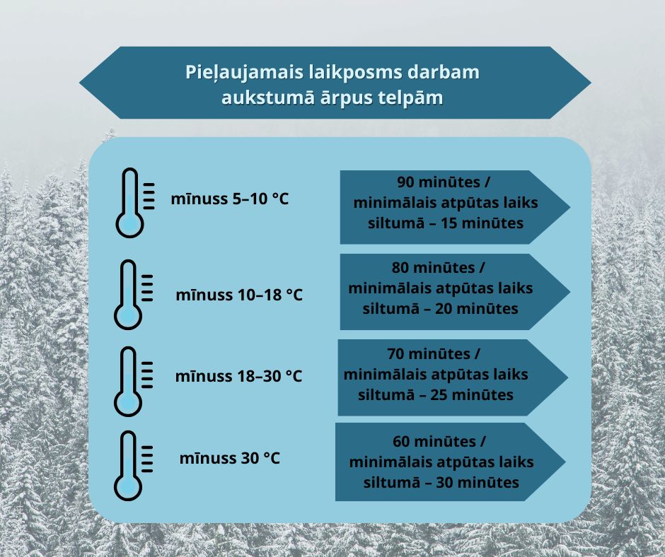 Pieļaujamais laikposms darbam ārpus telpām Ministru kabineta noteikumu Nr. 359 "Darba aizsardzības prasības darba vietās" 4. pielikumā norādīts atbilstoši faktiskajai gaisa temperatūrai, kuru nosaka, ņemot vērā individuālo aizsardzības līdzekļu lietošanas ietekmi, kā arī vēja ātrumu.