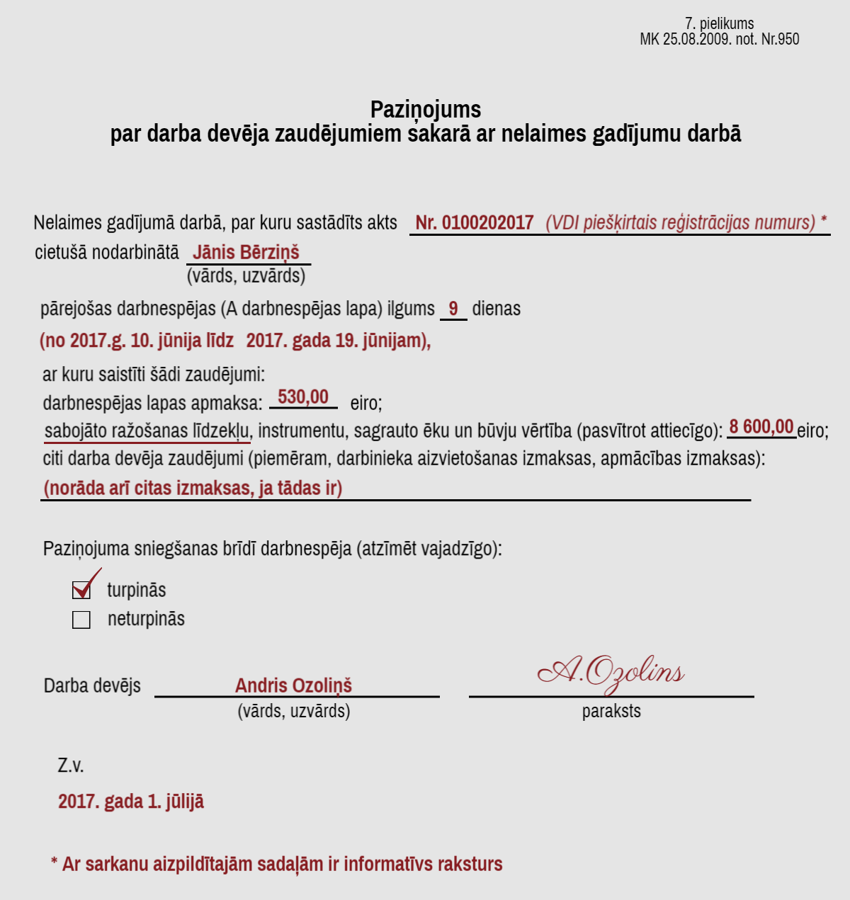 Darba devējs 30 dienu laikā pēc tam, kad nodarbinātais iesniedzis pārejošas darbnespējas lapu A, nosūta inspekcijai MK noteikumu Nr.950 7.pielikumā norādīto paziņojumu par darba devēja zaudējumiem sakarā ar nelaimes gadījumu.